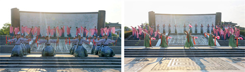 “泗水王刘靖”“婕妃”以诸侯之礼欢迎宾客,仪仗肃立、华盖蔽日,再现兴盛时期“大汉酒国”的荣耀与威仪。基地员工依诸侯礼节表演了六佾文舞,彩带纷飞、古韵十足,展现了“仁义礼智信”的中华正统文化精髓。