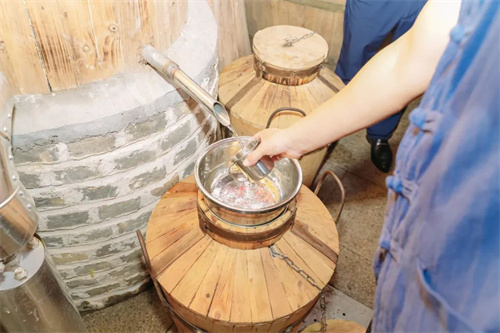 “出酒喽!淌好酒咯!”随着酿酒师傅一声口号,2023年头排原酒顺着甑桶的出酒口潺潺流出。